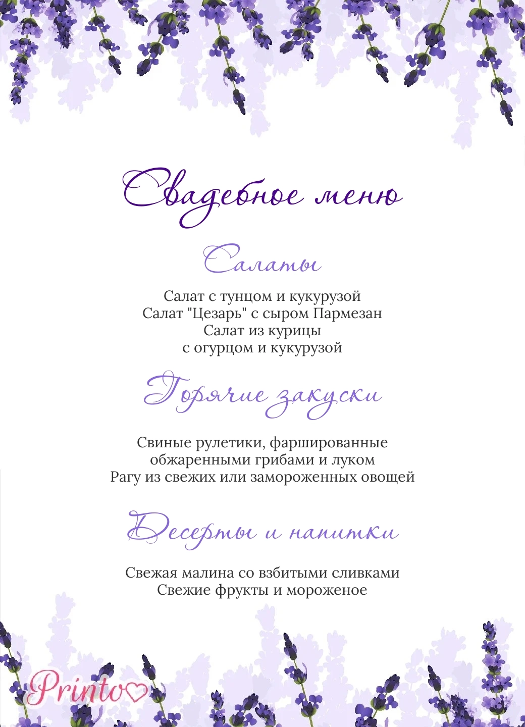 На листе меню обычно указывают блюда, которые будут поданы на свадьбе, а так же напитки и десерты.