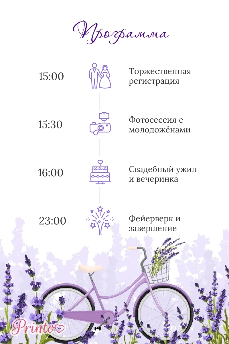 Расскажите гостям о программе свадьбы. Укажите время начала и окончания, а так же основные мероприятия.