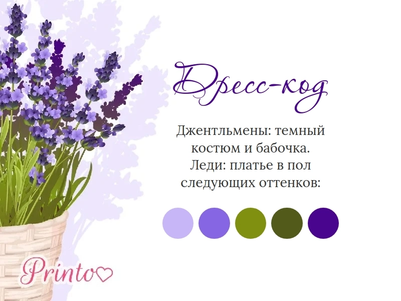 Укажите, какой дресс-код предпочтителен на вашей свадьбе. Вставьте на слайд палитру цветов, которые будут преобладать на свадьбе.