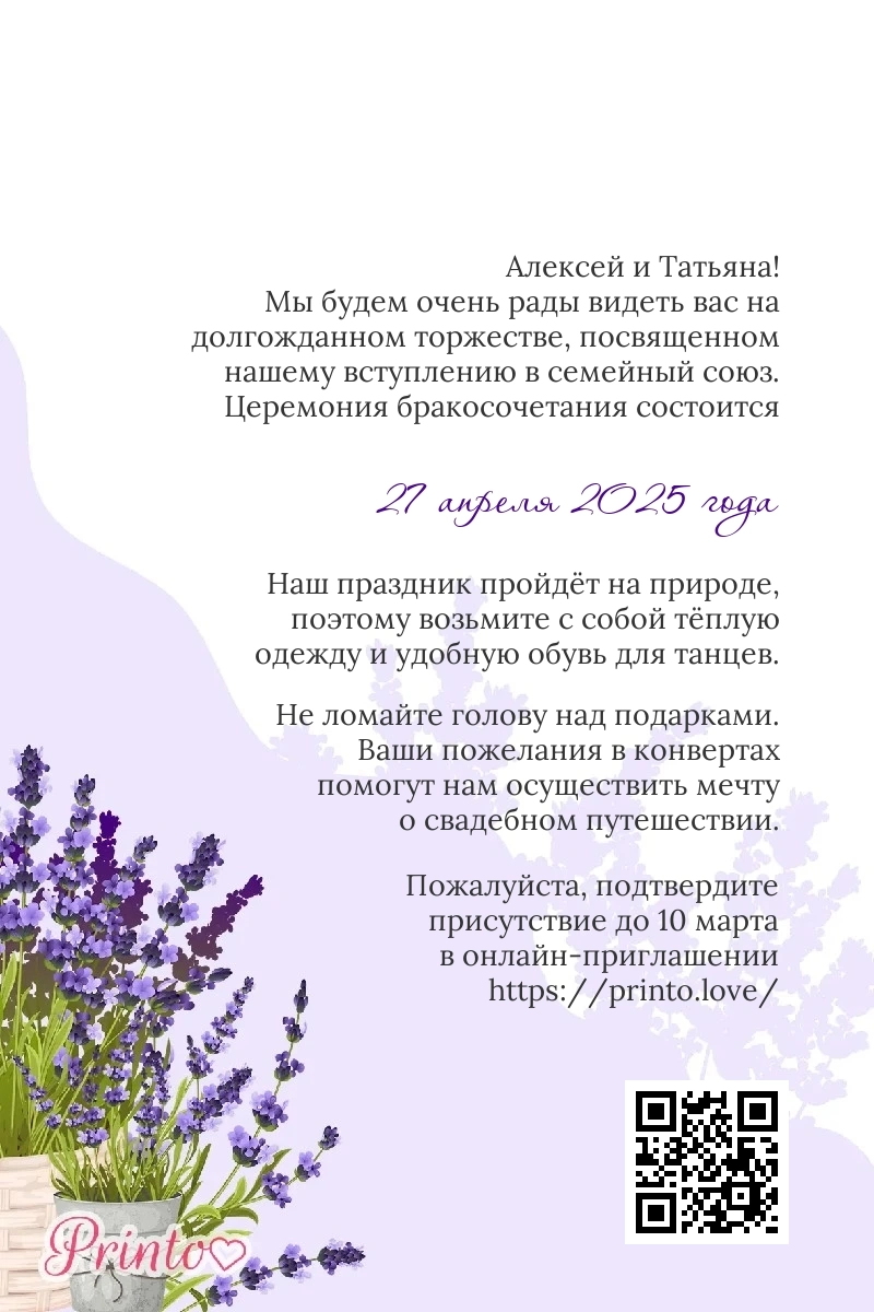 На листе может располагаться персональная ссылка, а так же QR-код на именное цифровое приглашение. Таким образом гости, получившие печатное приглашение, смогут узнать больше о свадьбе и подтвердить присутствие в онлайне.