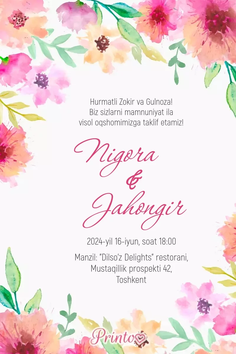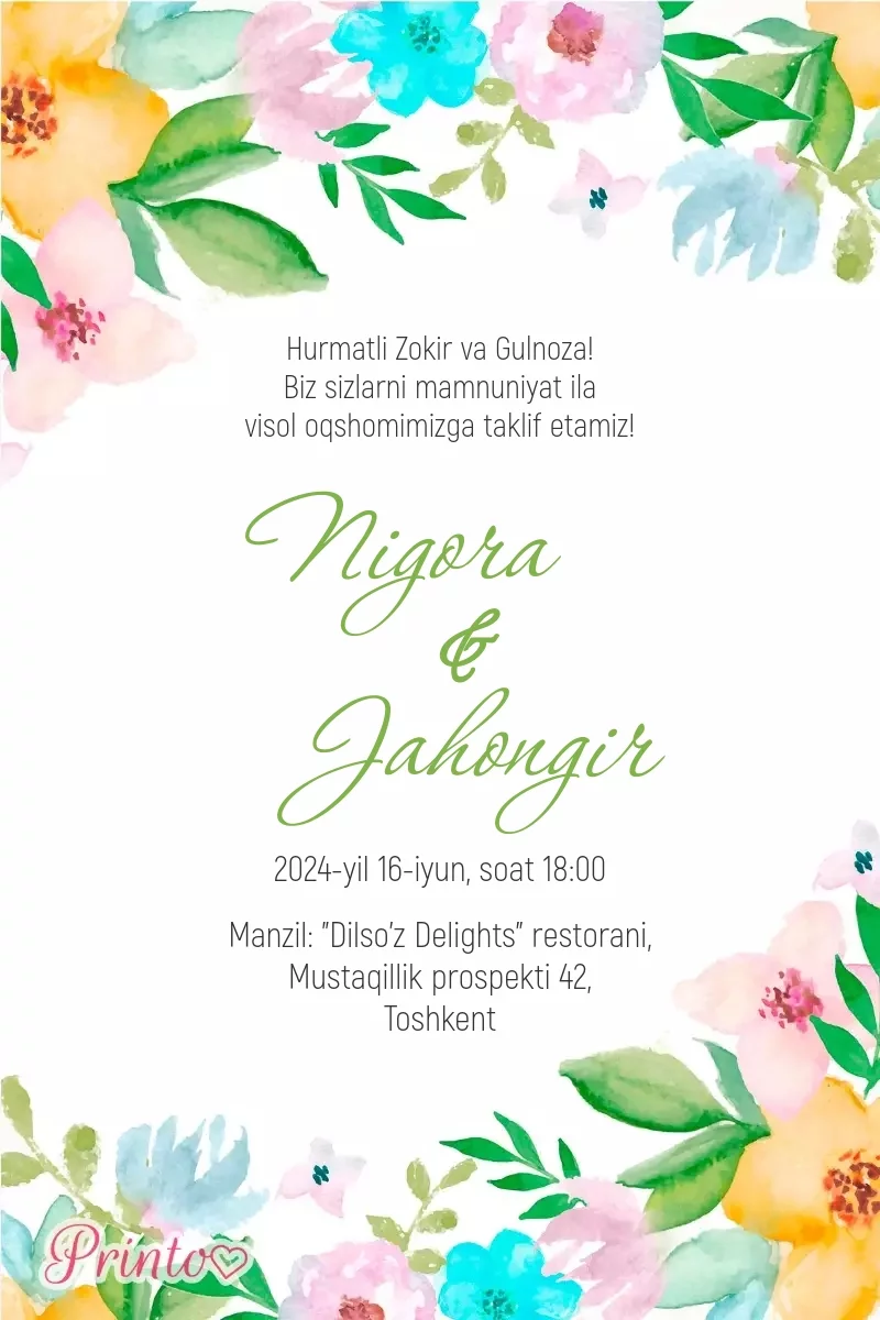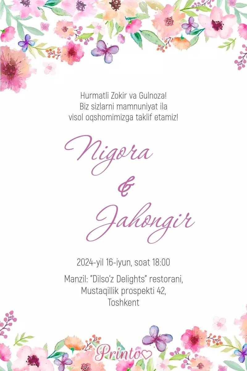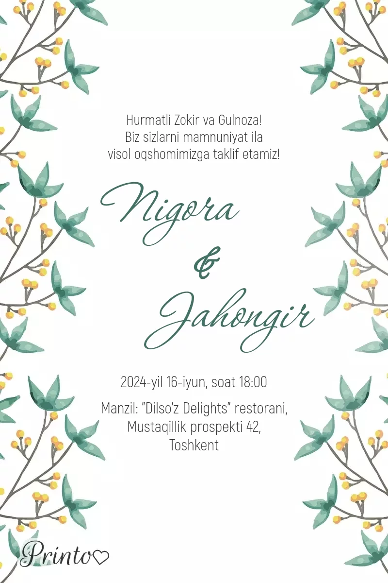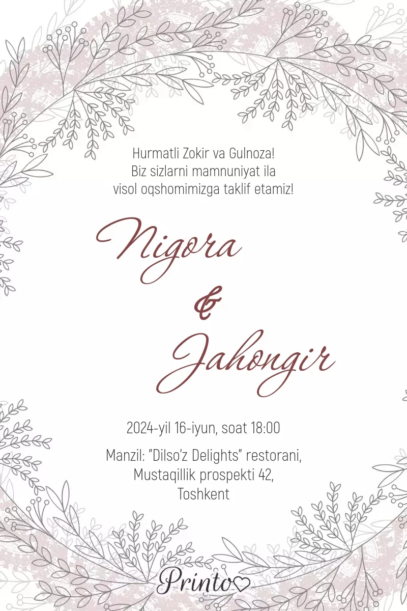 Dizaynlar to’y tashkil qilish uchun barcha zarur narsalarni o'z ichiga oladi - raqamli va chop etiladigan taklifnomalardan tortib to joylash kartochkasigacha va menyuga qadar.